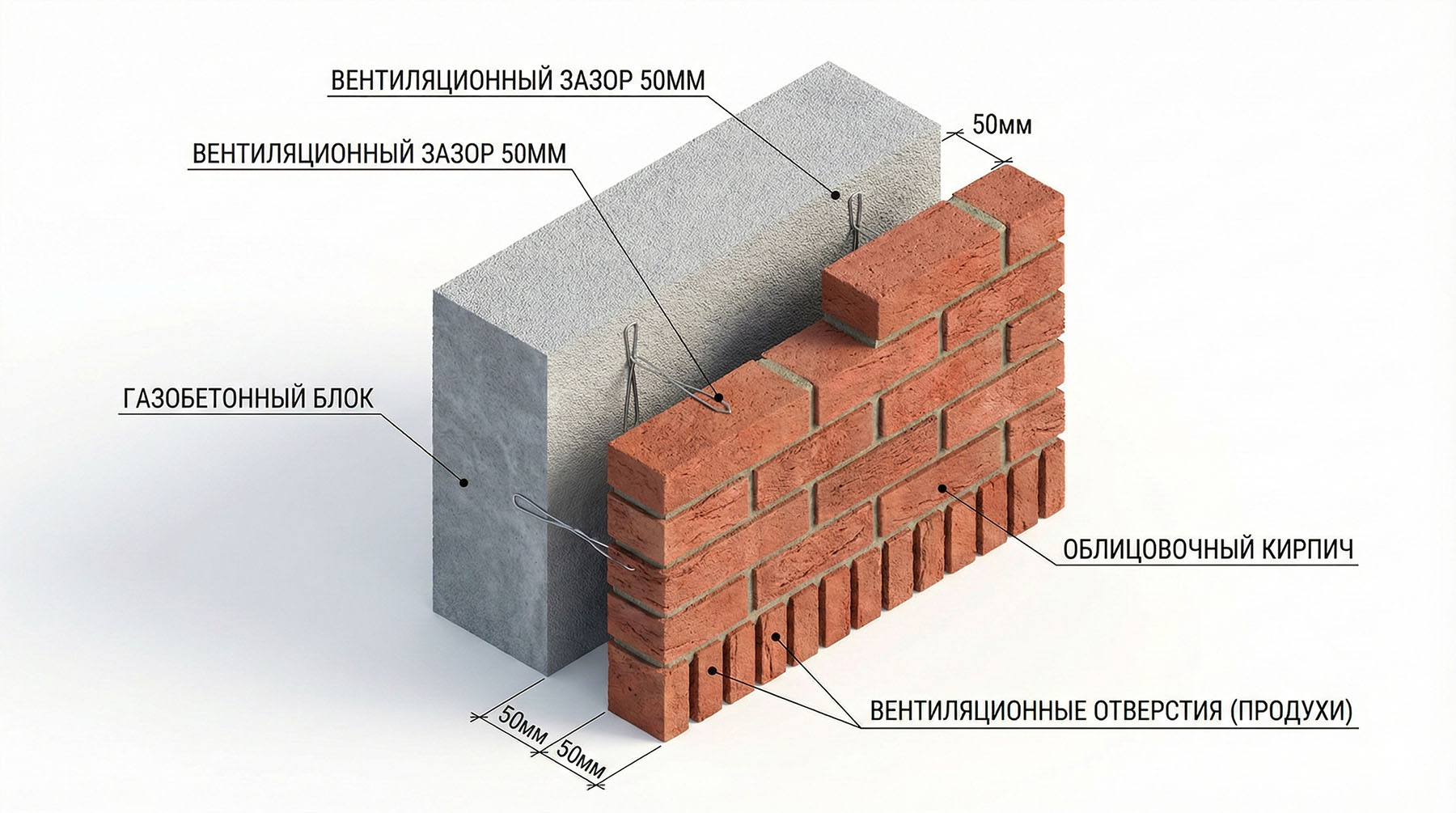 - Главное условие: Между кирпичом и газобетоном обязательно оставляется вентзазор шириной 30–50 мм.