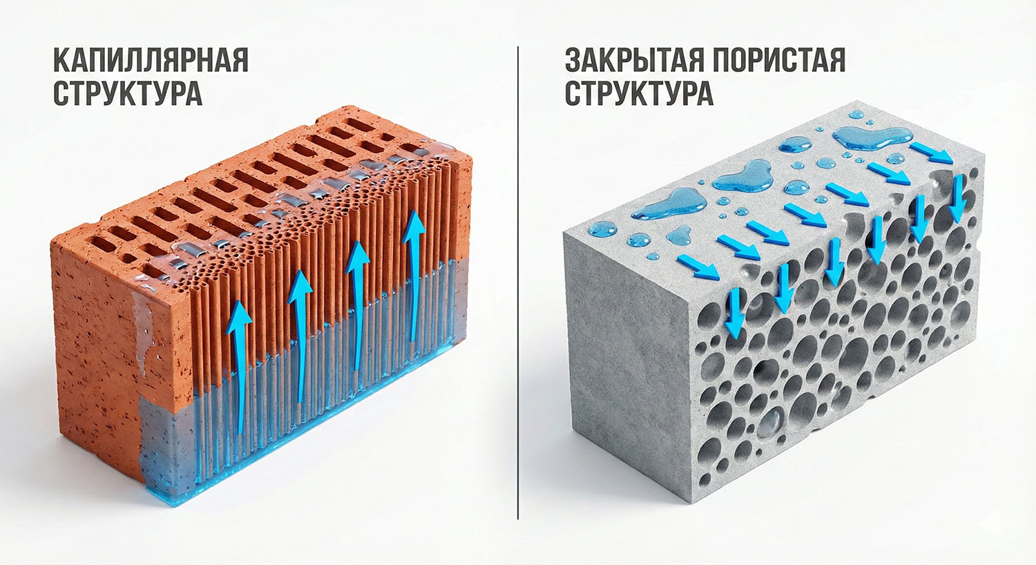 Кирпич пронизан тончайшими капиллярами — это как микро-трубочки. Если поставить кирпич в лужу, вода по этим трубкам поднимется высоко вверх. Это называется капиллярным подсосом.